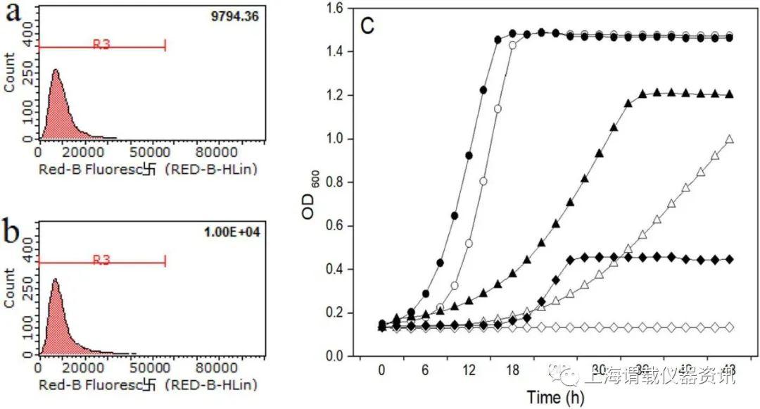 圖1。流式細(xì)胞儀分析和全自動(dòng)生長(zhǎng)曲線分析儀監(jiān)測(cè)的酵母菌株的細(xì)胞生長(zhǎng)情況。(a)菌株Et20的DNA含量。(b)參考菌株S288c的DNA含量。(c)使用Bioscreen全自動(dòng)生長(zhǎng)曲線分析儀在含有5%(●○),10%(▲△三角形)和20%(◇◆)乙醇的YPD中生長(zhǎng)的初始菌株20-Ha4(○、△、◇)和乙醇馴化的菌株Et20(●、▲、◆)的細(xì)胞生長(zhǎng)情況。