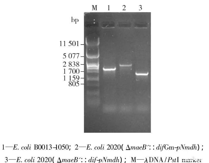 為了實現(xiàn)蘋果酸脫氫酶基因的穩(wěn)定遺傳并控制其表達量在較低水平,將mdh基因整合表達于重組菌中。根據(jù)之前的基因敲除方法,將同源重組突變盒maeB'::difGm連接至pMD18-T-maeB'::pNmdh,構(gòu)建突變盒maeB'::difGm-pNmdh,使用該突變盒在敲除maeB基因的同時,將基因mdh整合于重組大腸桿菌染色體上?;蛘系尿炞C結(jié)果見圖6。由圖6可知,mdh已整合于重組菌染色體上,將該菌命名為E.coli 2040。