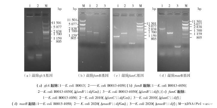 基因fumB、fumC和maeB的敲除驗證見圖2(c)~圖2(d),使用相同引物對出發(fā)菌株和基因敲除菌株進行PCR,擴增產(chǎn)物的大小有明顯差異,證明目標(biāo)基因片段已從染色體上刪除。對3株基因敲除重組菌分別命名為E.coli 2010、E.coli 2020和E.coli 2030。對于fumA基因,考慮到其主要在有氧條件下作用[13],為保證菌體在有氧條件下的正常生長,本研究未對其進行敲除。