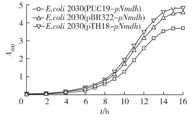 繪制含不同拷貝數(shù)質(zhì)粒的重組菌在M9培養(yǎng)基中的生長曲線,結(jié)果見圖5。由圖5可知:在相同的培養(yǎng)條件下,攜帶高拷貝質(zhì)粒的重組菌所能達到的菌體濃度明顯小于攜帶中低拷貝數(shù)質(zhì)粒的重組菌,這是因為更多的能量被用于蛋白質(zhì)合成而影響了菌體的生長。其余2個重組菌的生長狀況相似,對比于重組菌E.coli 2030,最終的菌體濃度也沒有太大差別。這表明蘋果酸脫氫酶的表達量應(yīng)控制在中低水平,過高則會影響菌體的生長。