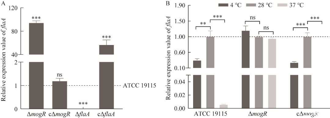 圖7鞭毛絲蛋白基因flaA的轉(zhuǎn)錄表達(dá)水平A:4℃條件下與親本株ATCC 19115相比,ΔmogR、cΔmogR、ΔflaA和cΔflaA的flaA的相對(duì)表達(dá)量.B:與28℃相比,4℃和37℃條件下ATCC 19115、ΔmogR和cΔmogR的flaA的相對(duì)表達(dá)量