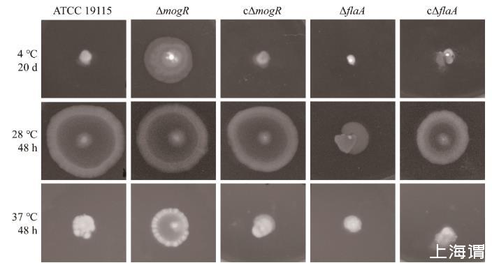 圖3菌株ATCC 19115、ΔmogR、cΔmogR、ΔflaA和cΔflaA分別在4、28、37℃下的運(yùn)動(dòng)能力