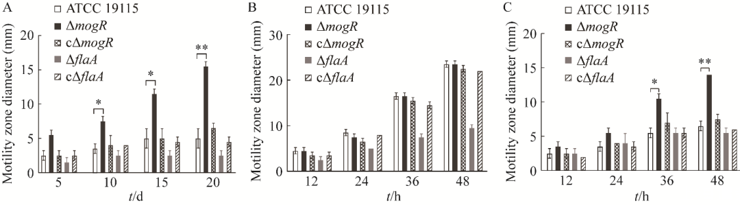 圖4菌株ATCC 19115、ΔmogR、cΔmogR、ΔflaA和cΔflaA分別在4℃(A)、28℃(B)和37℃(C)下的運(yùn)動(dòng)圈直徑大小