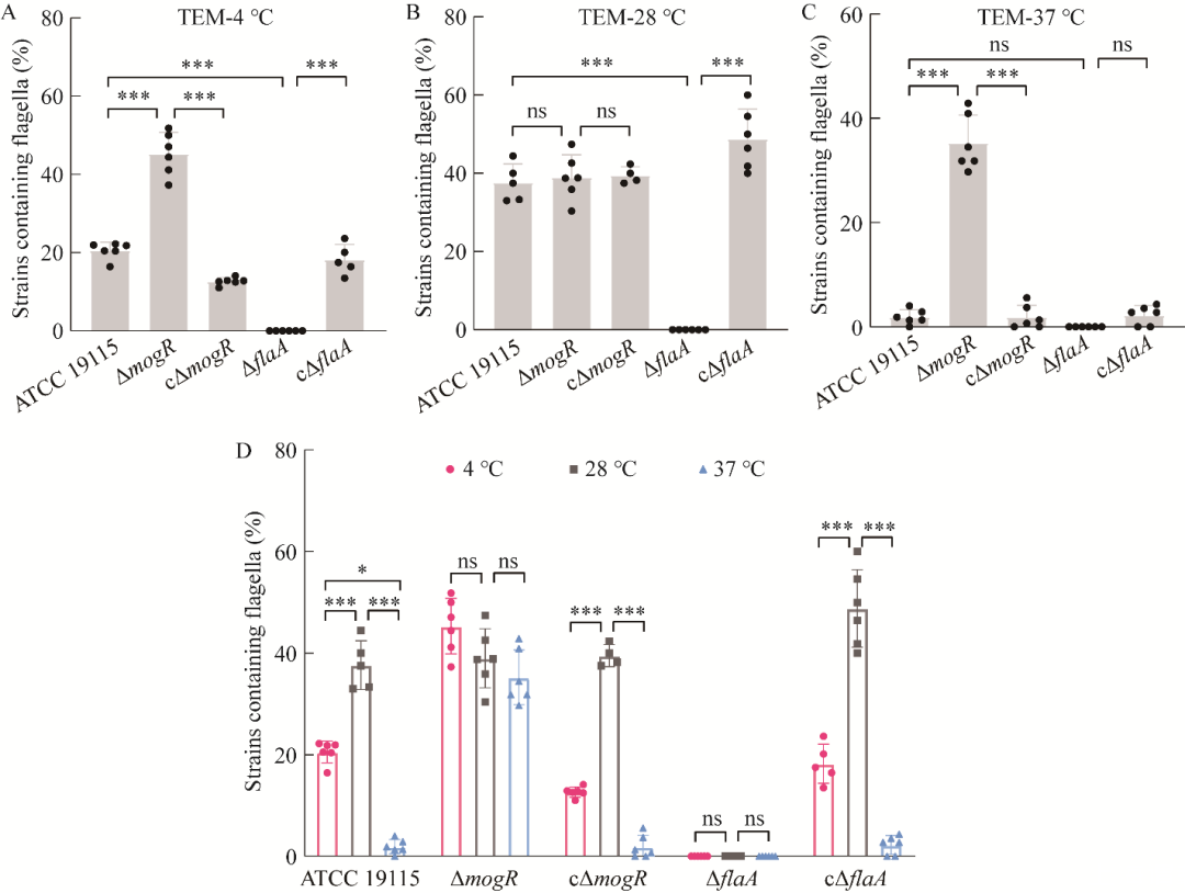 圖6通過TEM觀察的菌株ATCC 19115、ΔmogR、cΔmogR、ΔflaA和cΔflaA分別在4℃(A)、28℃(B)和37℃(C)時(shí)的單位樣品菌量中至少含有一根鞭毛的菌株的百分比柱狀圖及同一菌株在不同溫度下的菌株的百分比柱狀圖(D)