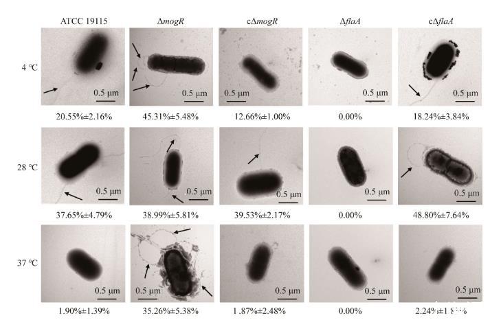 圖5透射電鏡(TEM)下觀察到的菌株ATCC 19115、ΔmogR、cΔmogR、ΔflaA和cΔflaA分別在4、28、37℃時(shí)的鞭毛生長情況顯示在圖像下方的數(shù)值是單位樣品菌量中至少含有一根鞭毛的菌株的百分比