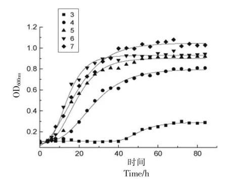 由圖2及表2可知,當(dāng)pH值為3時,此時μmax為0.003 h-1,Lag為48.1 h;當(dāng)pH值增加至6時,此時μmax最大,Lag最短,分別為0.019 h-1,11.7 h;當(dāng)pH值增加至7時,μmax下降,Lag增加,其Nmax達(dá)到最大值。以上表示pH值在3~7范圍內(nèi),短乳桿菌均能生長,表現(xiàn)出良好的耐酸能力,當(dāng)pH值為6時短乳桿菌生長速率最大,能更好的啟動發(fā)酵。