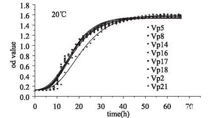 由表3及圖2修正的Gompertz的擬合結(jié)果可知,20℃時Vp 18菌株的生長最快,方差分析可知,與Vp5,Vp 8,Vp 14,Vp 2均存在顯著性差異(p<0.05)與Vp 16,Vp 17,Vp 21不存在顯著性差異(p>0.05),Vp 17次之,僅與Vp 2存在顯著性差異,Vp5生長最慢,但其僅與Vp 18有顯著性差異;8株菌的延滯期無顯著性差異(p>0.05);Vp2的最大生長量最大,但與Vp5沒有顯著性差異(p>0.05),與其他的菌株都有顯著性差異(p<0.05)。Vp18的最大生長量最小,與Vp2和Vp5有顯著性差異(p<0.05),與其他的菌株均無顯著性差異(p>0.05)。