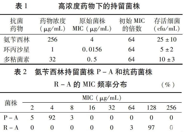 在高藥物濃度的培養(yǎng)條件(氨芐西林256μg/mL,環(huán)丙沙星1μg/mL,多粘菌素32μg/mL)下,持續(xù)作用6 d,依然能夠檢測到存活的細菌。按照接種量104 cfu/mL數(shù)量級計算,存活率在0.1%左右(表1)。此試驗結果表明,即使在有限的空間內(nèi),只要初始接種量達到一定數(shù)量,高于致死濃度的抗菌藥物并不能完全殺死細菌,總會有一小部分細菌存活下來。