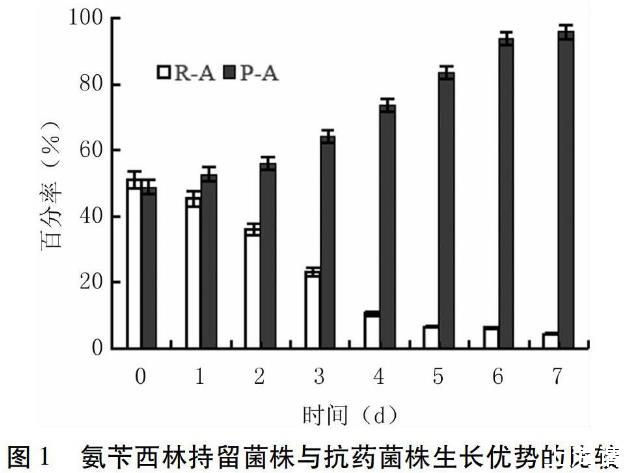 氨芐西林處理的P-A和R-A菌株MIC范圍無相互交叉,將二者等比例混合接種培養(yǎng),根據(jù)穩(wěn)定的MIC范圍統(tǒng)計其比例變化。如圖1所示,混合培養(yǎng)后,持留菌株P-A所占比例逐漸升高,到第4 d增至70%以上,至第7 d抗藥菌株R-A比例低于5%,菌株P-A數(shù)量占絕對優(yōu)勢。此結果表明,在沒有藥物的培養(yǎng)條件下,P-A具有更強的生長優(yōu)勢。隨機挑選氨芐西林作用下存活的其它持留菌株和抗藥菌株,用同樣的方法對比其生長優(yōu)勢,也有類似的結果(數(shù)據(jù)略)。另外兩種藥物環(huán)丙沙星和多粘菌素的持留菌株和抗藥菌株,生長優(yōu)勢的比較也存在類似結果(數(shù)據(jù)略),最終都能體現(xiàn)出持留菌株具有更強的生長優(yōu)勢。本研究中共檢測8組菌株的對比,未檢測到例外情況。