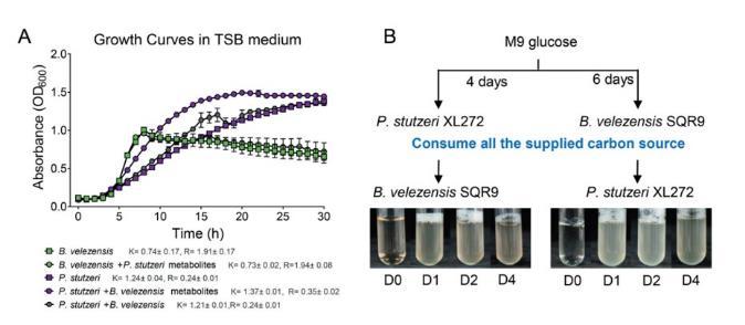 圖2、(A)在純TSB培養(yǎng)基中培養(yǎng)的單一培養(yǎng)物(正方形)、在添加了10%其他物種上清液的TSB上生長的單一培養(yǎng)物(圓形)和共培養(yǎng)物(六邊形)的生長曲線。芽孢桿菌SQR9 TSB用過的培養(yǎng)基促進了施氏假單胞菌XL272的生長?!癒”表示生長能力,“R”表示生長速率,由生長曲線的R包計算得出。(B)M9用過的培養(yǎng)基實驗的示意圖。分離物在M9葡萄糖培養(yǎng)基中獨立生長6天(芽孢桿菌SQR9)或4天(施氏假單胞菌XL272)直到檢測到葡萄糖,然后從懸浮液中濾出細胞。