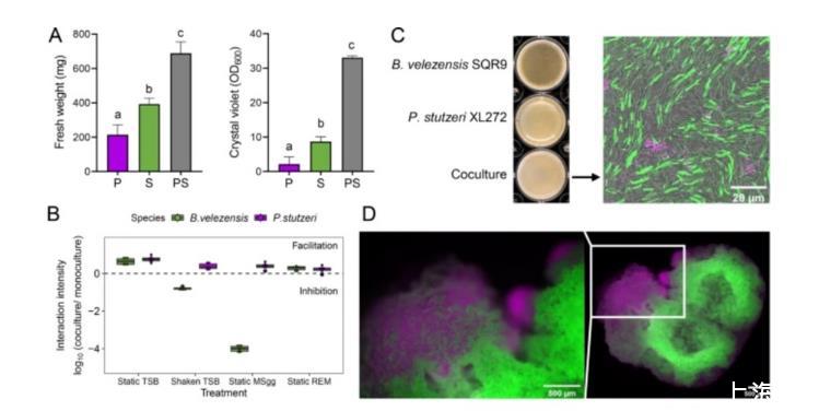 圖1、施氏假單胞菌XL272和芽胞桿菌SQR9在某些條件下協(xié)同形成生物膜。通過鮮重和結晶紫測定法定量生物膜生物量。(A)生物膜在靜態(tài)TSB培養(yǎng)基中培養(yǎng)。P代表施氏假單胞菌XL272單培養(yǎng)薄膜,S代表芽胞桿菌SQR9單培養(yǎng)薄膜,PS代表共培養(yǎng)薄膜。條形代表平均值±sd(n=6)。根據(jù)方差分析,通過Prism 8進行的Tukey檢驗,不同的字母表示具有統(tǒng)計學意義的差異。(B)相互作用強度定義為共培養(yǎng)中DNA拷貝相對于單一培養(yǎng)中平均DNA拷貝的對數(shù)刻度。靜態(tài)TSB和靜態(tài)REM(根系分泌物培養(yǎng)基)代表結構化、營養(yǎng)豐富的條件,搖動的TSB代表非結構化、營養(yǎng)豐富的條件,靜態(tài)MSgg代表結構化、營養(yǎng)有限的條件。合作只發(fā)生在結構化、營養(yǎng)豐富的條件下。(C)TSB培養(yǎng)基中單一培養(yǎng)和共培養(yǎng)的生物膜形成。在CLSM下觀察由施氏假單胞菌XL272(洋紅色)和芽胞桿菌SQR9(綠色)形成的生物膜。井徑為15.6毫米。(D)在TSB瓊脂上生長的菌落。DsRed標記的施氏假單胞菌XL272被染成洋紅色,GFP標記的芽胞桿菌SQR9被染成綠色。
