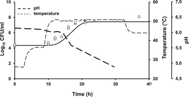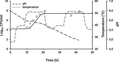 圖5、在周期性變化的溫度(37°C下24小時、42°C下12小時和45°C下24小時)下儲存的淡奶中觀察到的(點)和預(yù)測的(線)嗜熱脂肪芽孢桿菌ATCC 7953生長的比較。不連續(xù)的線表示牛奶的pH值(---)和溫度變化(------)。