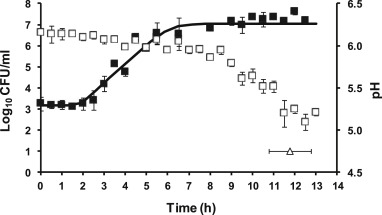 圖2、在最佳生長溫度(62°C)下儲存期間,源自煉乳(淡奶)中的孢子(■)和pH演變(□)的嗜熱脂肪芽孢桿菌ATCC 7953細胞的生長動力學(xué)。黑色實線(?)描繪了Baranyi和Roberts模型對增長數(shù)據(jù)的擬合。白點(○)表示觀察到的牛奶凝結(jié)時間。每個點是八個值的平均值。垂直和水平條表示標準偏差。