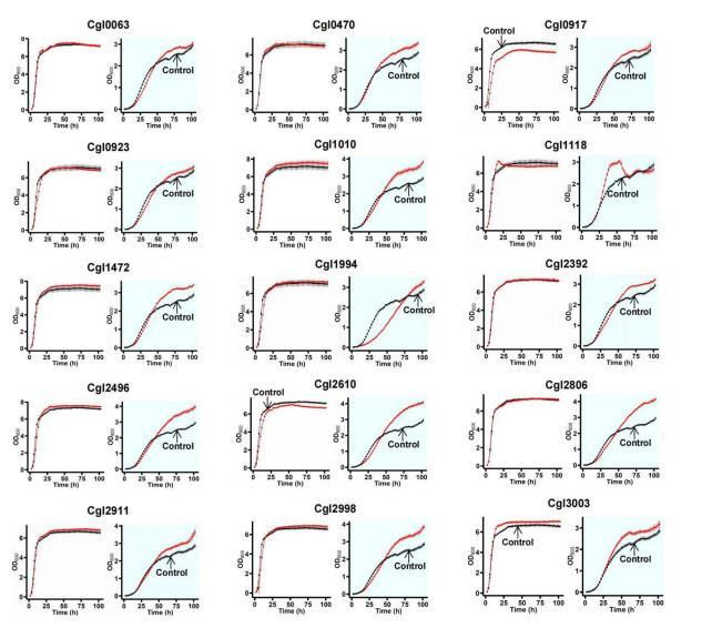 所有基因均顯示了30h至終點(diǎn)生長(zhǎng)過(guò)程連續(xù)15個(gè)最大值的平均值,其中最上面的深色點(diǎn)是15個(gè)值均提高20%以上的基因,下面的深色點(diǎn)代表15個(gè)值均降低20%以上的基因。生長(zhǎng)提高的基因一共29個(gè),包括以下基因cgl0011、cgl0063、cgl0470、cgl0487、cgl0489、cgl0490、cgl0893、cgl0917、cgl0923、cgl1010、cgl1118、cgl1367、cgl1472、cgl1532、cgl1541、cgl1605、cgl1653、cgl1941、cgl1994、cgl2392、cgl2496、cgl2610、cgl2735、cgl2806、cgl2937、cgl2911、cgl2998、cgl3003、cgl3098。