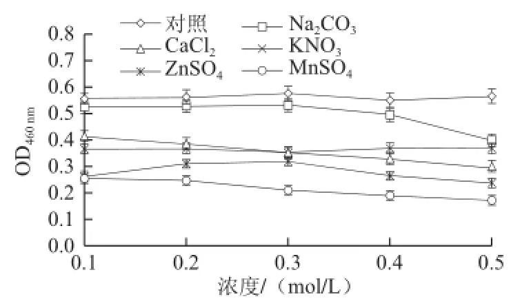 由圖2可知,5種金屬鹽的不同濃度對(duì)LJ-G1菌生長(zhǎng)均有不同程度的影響,運(yùn)用F檢驗(yàn)的方法,對(duì)各種差異進(jìn)行統(tǒng)計(jì)學(xué)分析得知:Na2CO3濃度在0.3 mol/L之前與對(duì)照組比其影響無顯著差異(P>0.05),不具有統(tǒng)計(jì)學(xué)意義,但0.5 mol/L與0.3 mol/L相比呈明顯的抑制作用(P<0.05);CaCl2濃度0.1 mol/L與0.5 mol/L相比差異顯著(P<0.05),濃度愈大抑制作用愈強(qiáng),具有統(tǒng)計(jì)學(xué)意義;KNO3這5個(gè)濃度的影響比較一致;ZnSO4濃度為0.3 mol/L時(shí)抑制作用最小,0.3 mol/L分別與0.1 mol/L和0.5 mol/L相比差異顯著(P<0.05),具有統(tǒng)計(jì)學(xué)意義;MnSO4濃度為0.1 mol/L時(shí)抑制作用相對(duì)較小,與0.5 mol/L相比差異顯著(P<0.05),具有統(tǒng)計(jì)學(xué)意義。由圖2還可知,與對(duì)照組比較,5種金屬鹽對(duì)LJ-G1菌生長(zhǎng)的抑制作用由弱到強(qiáng)依次為Na2CO3<CaCl2<KNO3<ZnSO4<MnSO4。