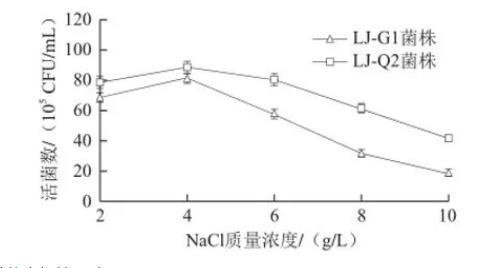 在葡萄糖質(zhì)量濃度為7 g/L、pH值為7時(shí),改變滲透壓(NaCl質(zhì)量濃度)分別為2、4、6、8、10 g/L,考察滲透壓對(duì)腸道菌生長(zhǎng)的影響,結(jié)果見圖7。LJ-G1和LJ-Q2活菌數(shù)隨NaCl質(zhì)量濃度的升高而增大,NaCl質(zhì)量濃度為4 g/L時(shí)達(dá)到最大,超過4 g/L之后活菌數(shù)明顯呈下降趨勢(shì),且下降幅度較大。原因是隨NaCl質(zhì)量濃度的繼續(xù)增高,會(huì)提高環(huán)境的滲透壓從而使菌不能繼續(xù)生長(zhǎng),由此可知NaCl適宜質(zhì)量濃度為4 g/L左右。