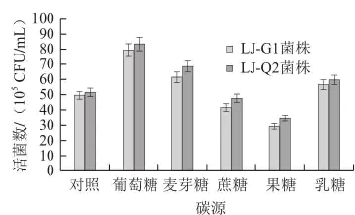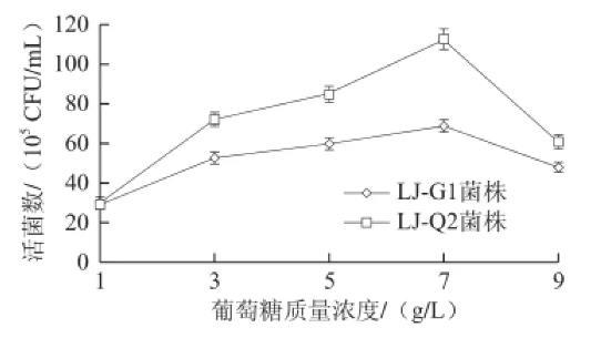 在pH 7、NaCl質(zhì)量濃度為4 g/L時(shí),改變葡萄糖質(zhì)量濃度分別為1、3、5、7、9 g/L,考察不同葡萄糖質(zhì)量濃度對(duì)腸道菌生長(zhǎng)的影響,結(jié)果見圖5。LJ-G1和LJ-Q2菌株菌落數(shù)在葡萄糖質(zhì)量濃度為1~7 g/L時(shí)呈上升趨勢(shì),當(dāng)葡萄糖質(zhì)量濃度為7 g/L時(shí)活菌數(shù)量值達(dá)到最大,此后隨質(zhì)量濃度增高,活菌落數(shù)快速下降,原因是滲透壓升高,不利于菌的生長(zhǎng)。葡萄糖對(duì)LJ-Q2菌的影響高于LJ-G1菌。