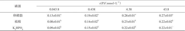 在液體搖床培養(yǎng)試驗(yàn)中,禾谷鐮刀菌在卵磷脂、植酸和K2HPO4為唯一磷源的液體培養(yǎng)基中培養(yǎng)7 d后,菌絲生物量的測定結(jié)果見表2。不同磷源物質(zhì)對(duì)禾谷鐮刀菌菌絲生物量的影響差別很大。以卵磷脂為唯一磷源,菌絲生物量顯著高于對(duì)照組K2HPO4,說明卵磷脂更有利于禾谷鐮刀菌生長,磷濃度為4.38 mmol/L時(shí),卵磷脂菌絲生物量達(dá)到0.28 g,而同一磷濃度下K2HPO4組生物量為0.22 g,植酸組生物量為0.23 g。植酸與K2HPO4相比,對(duì)禾谷鐮刀菌菌絲體生長促進(jìn)效果不顯著,說明植酸與無機(jī)磷酸根離子對(duì)禾谷鐮刀菌生長的有效性相同。同一磷源物質(zhì),濃度不同對(duì)菌絲生物量也有很大影響。當(dāng)磷濃度為0.043 8 mmol/L時(shí),卵磷脂菌絲生物量為0.13 g,當(dāng)磷濃度為4.38 mmol/L時(shí),菌絲生物量可達(dá)到0.28 g,菌絲生物量增加了1.2倍。