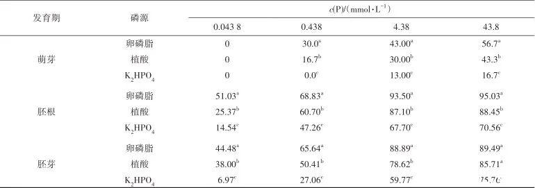 不同有機(jī)磷不僅影響禾谷鐮刀菌的生長,而且還影響其代謝產(chǎn)物。生測試驗(yàn)結(jié)果表明:以卵磷脂、植酸為唯一磷源培養(yǎng)禾谷鐮刀菌的發(fā)酵培養(yǎng)液對(duì)種子的萌發(fā),胚根胚芽生長的抑制作用差異顯著(圖3)。不同磷源條件下禾谷鐮刀菌培養(yǎng)液對(duì)玉米種子萌發(fā)抑制率、胚根抑制率和胚芽抑制率的影響見表3。卵磷脂的發(fā)酵培養(yǎng)液明顯強(qiáng)于無機(jī)磷K2HPO4對(duì)種子生長抑制作用,當(dāng)磷濃度為43.8 mmol/L時(shí),卵磷脂組對(duì)種子的萌發(fā)抑制率可達(dá)到56.7%,對(duì)種子胚根的抑制率可達(dá)95.03%,對(duì)胚芽的抑制率可達(dá)到89.49%;植酸的發(fā)酵培養(yǎng)液僅次于卵磷脂但明顯強(qiáng)于K2HPO4對(duì)種子生長抑制作用,同一磷濃度條件下,植酸組對(duì)種子的萌發(fā)抑制率可達(dá)到43.3%,對(duì)種子胚根的抑制率高達(dá)88.45%,對(duì)胚芽的抑制率可達(dá)85.71%。