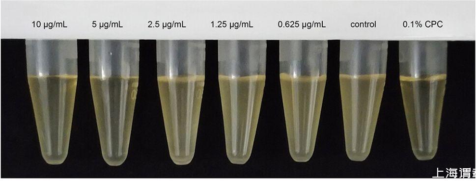 圖4、孵育24 h后各組溶液的濁度。將各組溶液轉(zhuǎn)移至離心管中并拍照,10μg/mL、5μg/mL AgBr-NP CTMAB溶液和CPC溶液組與NC組相比,濁度明顯降低。2.5μg/mL、1.25μg/mL、0.625μg/mL AgBr-NP CTMAB溶液與陰性對(duì)照組的濁度無顯著差異。