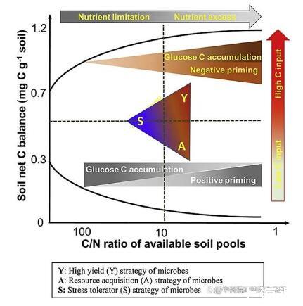 圖1微生物生活策略對(duì)激發(fā)效應(yīng)和土壤碳平衡的化學(xué)計(jì)量調(diào)節(jié)機(jī)制的概念圖
