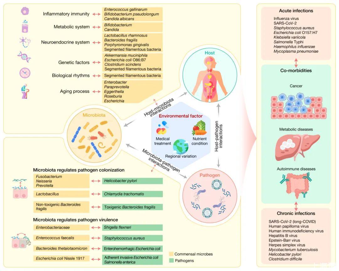 本文首先詳細(xì)介紹了微生物群在急性感染(流感病毒、鏈球菌感染等)、慢性感染(人類免疫缺陷病毒、結(jié)核分枝桿菌感染等)及感染相關(guān)共?。ò┌Y、代謝性疾病和自身免疫?。┲邪l(fā)揮的“雙刃劍”調(diào)控作用。隨后,系統(tǒng)梳理了微生物群與人類宿主、入侵病原體間組成的三維互作網(wǎng)絡(luò)與調(diào)控機制,一方面回顧了微生物群通過與入侵病原體的直接相互作用影響病原體的定植和致病能力,另一方面總結(jié)了微生物群通過調(diào)控宿主炎癥免疫、代謝、神經(jīng)內(nèi)分泌、遺傳因素、生物節(jié)律與衰老等多個方面間接影響病原體感染的結(jié)局。進一步地,文章探討了外界環(huán)境因素(包括醫(yī)療干預(yù)、膳食營養(yǎng)和地域差異)對微生物群—人類宿主—病原體互作網(wǎng)絡(luò)的動態(tài)調(diào)控機制(圖1)。