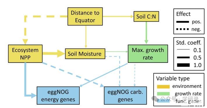 最后,研究通過結(jié)構(gòu)方程模型(SEM)進(jìn)行了總結(jié),說明了氣候、土壤性質(zhì)、細(xì)菌生長(zhǎng)潛力和碳循環(huán)功能之間的聯(lián)系(圖4),即細(xì)菌的生長(zhǎng)潛力主要由土壤性質(zhì)驅(qū)動(dòng),如水分和碳物質(zhì)的有效性,又反過來受生產(chǎn)力(如生態(tài)系統(tǒng)凈初級(jí)生產(chǎn)力、與赤道的距離)的控制。