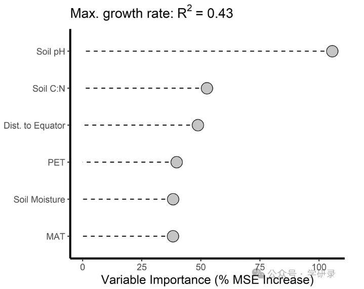 圖2隨機(jī)森林回歸模型顯示細(xì)菌群落平均最大生長(zhǎng)速率的最強(qiáng)環(huán)境預(yù)測(cè)因子