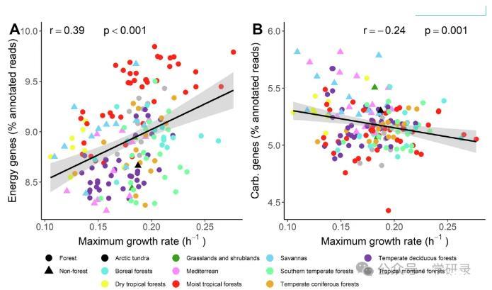 因此,為了更好的理解和預(yù)測(cè)生態(tài)系統(tǒng)碳循環(huán)和儲(chǔ)存的變化,需要更好的了解微生物生長(zhǎng)潛力的模式和驅(qū)動(dòng)因。
