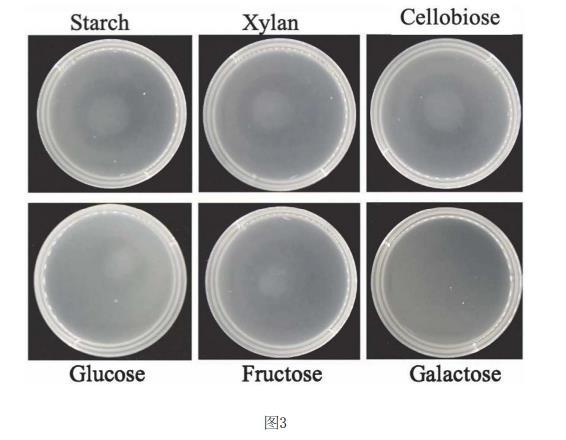 結(jié)果如圖3所示,以淀粉、木聚糖、纖維二糖、葡萄糖、果糖或半乳糖作為可代謝底物時形成了明顯的趨化圈,說明牛月形單胞菌可調(diào)節(jié)碳水化合物的趨化性。
