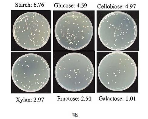 結(jié)果如圖2所示,以淀粉、木聚糖、纖維二糖、葡萄糖、果糖或半乳糖作為可代謝底物時,趨化性指數(shù)均大于1,說明牛月形單胞菌對淀粉、木聚糖、纖維二糖、葡萄糖、果糖或半乳糖可代謝底物產(chǎn)生正向趨化。
