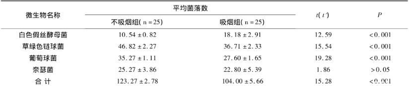 如表4所示,吸煙組白色假絲酵母菌的數(shù)量高于不吸煙組;吸煙組的草綠色鏈球菌和葡萄球菌數(shù)均顯著低于不吸煙組;奈瑟菌數(shù)量2組間無明顯差異。