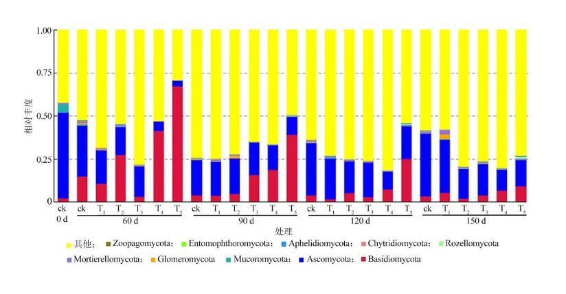 對添加不同比例枝條處理后土壤真菌群落組成分析發(fā)現(xiàn),在門水平上,所有土壤樣品相對豐度最高的10個門分別為擔子菌門(Basidiomycota)、子囊菌門(Ascomycota)、毛霉門(Mucoromycota)、球囊菌門(Glomeromycota)、被孢霉門(Mortierellomycota)、隱真菌門(Rozellomycota)、壺菌門(Chytridiomycota)、Aphelidiomycota、蟲霉門(Entomophthoromycota)和捕蟲霉門(Zoopagomycota)。擔子菌門(Basidiomycota)和子囊菌門(Ascomycota)的相對豐度最高,屬于優(yōu)勢菌群。其中,T2,T4,T5處理提高了60,90,120 d時擔子菌門(Basidiomycota)的相對豐度。各枝條添加處理均降低了60,120,150 d時子囊菌門(Ascomycota)的相對豐度。除T1處理外,其他添加枝條處理均降低了整個處理過程中毛霉門(Mucoromycota)和壺菌門(Chytridiomycota)的相對豐度(圖3)。
