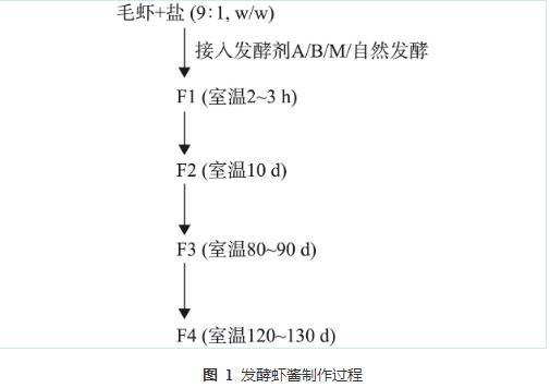 選定前期從自然蝦醬中分離解淀粉芽孢桿菌B.amyloliquefaciens Y11和貝萊斯芽孢桿菌B.velezensis Y12為發(fā)酵劑,將毛蝦清洗攪碎后接入發(fā)酵劑(1%,v/v),區(qū)別于傳統(tǒng)發(fā)酵中20%~30%高鹽添加量,參考目前已有制作低鹽蝦醬所采用的12%(w/w)的鹽分含量(其鹽分含量在8周發(fā)酵時(shí)間內(nèi)在10%~13%區(qū)間波動(dòng)),本研究所采用的鹽分添加量為10%(w/w),分別設(shè)置A、B、C、M四組。其中A組接入發(fā)酵劑解淀粉芽孢桿菌Y11;B組接入發(fā)酵劑貝萊斯芽孢桿菌Y12;C組為對照組(不接入菌株作為發(fā)酵劑)采取自然發(fā)酵方式;M組為同時(shí)接入發(fā)酵劑解淀粉芽孢桿菌Y11和貝萊斯芽孢桿菌Y12(1:1,v/v)進(jìn)行混菌發(fā)酵,于室溫(20℃左/>右)進(jìn)行。在F1(發(fā)酵的起始階段)、F2(發(fā)酵10 d)、F3(發(fā)酵80~90 d)、F4(發(fā)酵120~130 d)對四組樣品分別取樣(圖1)。