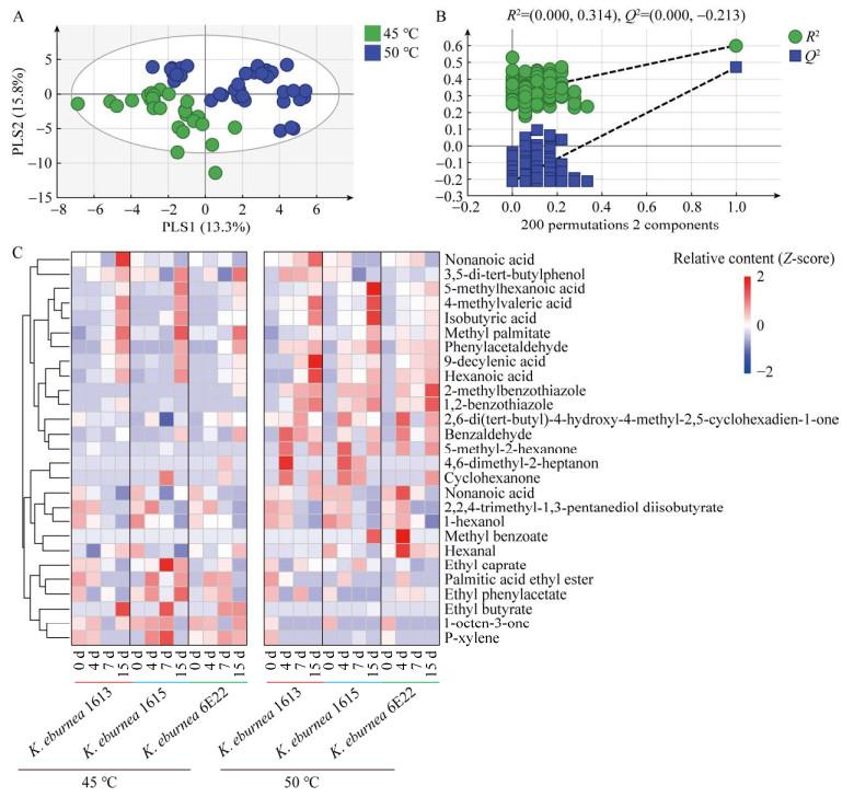 為找出不同發(fā)酵天數(shù)存在的特征差異化合物,分別對菌株K.eburnea 1613、K.eburnea 1615、K.eburnea 6E22發(fā)酵高粱揮發(fā)性物質(zhì)進行不同發(fā)酵天數(shù)的差異分析,PLS-DA顯示揮發(fā)性化合物組成特點差異顯著(P<0.05)(圖9A)。經(jīng)過200次置換驗證,R2大于Q2且Q2的起點為負數(shù),該參數(shù)證明PLS-DA模型是可靠的(圖9B)。使用VIP值大于1篩選出26種特征差異物質(zhì),使用Z-score標(biāo)準(zhǔn)化每種揮發(fā)性化合物并繪制聚類熱圖(圖9C)。1-烯-3-辛醇、2,3-二氫苯并呋喃和糠醛等在發(fā)酵第0天含量最高,糠醛被認(rèn)為與醬香型白酒基酒焦糊味正相關(guān)。苯甲醛、α-松油醇和2-甲基吡嗪類物質(zhì)在發(fā)酵第4天或第7天含量最高。α-松油醇是萜烯類化合物,具有松木香,是醬香型白酒中重要的香氣成分,可以讓酒體更加優(yōu)雅細膩。萜烯類、吡嗪類化合物可能在發(fā)酵過程中作為前體物質(zhì)被轉(zhuǎn)化為其他物質(zhì),有研究通過全基因組數(shù)據(jù)挖掘發(fā)現(xiàn)放線菌糖萊斯氏菌(Laceyella sacchari)具有四甲基吡嗪生物合成的完整途徑。苯乙醇、異戊酸、異丁酸、乙酸苯乙酯和棕櫚酸甲酯等在發(fā)酵第15天時含量最高。乙酸苯乙酯和棕櫚酸甲酯貢獻了酒體中的花香、果香風(fēng)味,屬于高沸點物質(zhì),能夠延長酒體后味。結(jié)果表明,象牙色克羅彭斯特德菌在堆積發(fā)酵的不同時間階段能積累不同的風(fēng)味化合物,可為生產(chǎn)中通過控制堆積發(fā)酵時間調(diào)控象牙色克羅彭斯特德菌的生長代謝提供理論參考。
