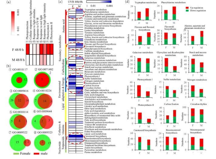 圖2展示了響應(yīng)UV-B輻射的差異表達(dá)基因的富集分析結(jié)果。a為雌雄紅豆杉樹木中八個光響應(yīng)GO分析。b為歸屬于八個光響應(yīng)GO術(shù)語的DEGs數(shù)量。c為多種代謝相關(guān)KEGG通路的顯著性分析,藍(lán)色表示顯著性P<0.01。d為每個顯著富集的KEGG通路中的DEGs數(shù)量。