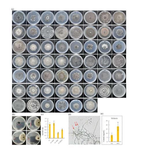 圖6展示了參與性別介導(dǎo)UV-B輻射響應(yīng)的內(nèi)生真菌的分離過程。a為分離的內(nèi)生真菌菌株在培養(yǎng)皿中的觀察結(jié)果。b為Guignardia菌株#1與Alternaria菌株#M3/M5/M14在PDA培養(yǎng)基上的共培養(yǎng)相互作用。c為Guignardia菌株#1在不同條件下生長速率的柱狀圖。d為從T.mairei中分離的Guignardia菌株#1的照片,紅色箭頭表示Guignardia菌株#1的孢子。e為Guignardia菌株#1在對照和UV-B輻射條件下的黑色素含量。