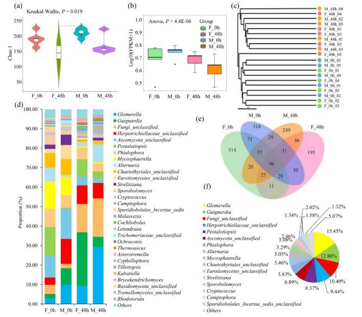 圖4展示了內(nèi)生真菌群落結(jié)構(gòu)的差異。a為通過Chao1指數(shù)進(jìn)行的alpha多樣性分析。b為通過Shannon指數(shù)進(jìn)行的alpha多樣性分析。c為通過UPGMA聚類進(jìn)行的beta多樣性分析。d為不同性別的T.mairei樹木在UV-B輻射下內(nèi)生真菌的相對豐度。e為不同性別的T.mairei樹木在UV-B輻射下差異真菌屬的韋恩圖分析。f為不同樣本組中常見真菌屬的比例。