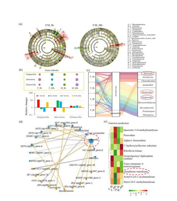 圖5展示了UV-B輻射和性別對T.mairei植物微生物組組裝的影響。a為通過線性判別分析效應(yīng)量分析(LEfSe)進(jìn)行的雌雄樹木內(nèi)生真菌在屬水平上的豐度差異的系統(tǒng)發(fā)育樹圖。b為不同樣本組中三種典型指示屬豐度差異的分析。c為三種典型指示屬在不同樣本組中相對豐度變化的?;鶊D。d為差異真菌屬與宿主DEGs的Pearson相關(guān)性分析。e為通過PICRUSt2程序?qū)θN典型真菌屬進(jìn)行功能預(yù)測。