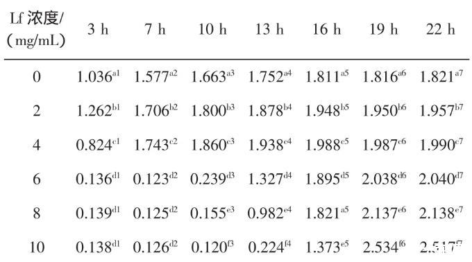 培養(yǎng)0~7 h時(shí),在對照組、2 mg/mL組、4 mg/mL組中大腸桿菌的菌密度迅速上升,最先達(dá)到穩(wěn)定期;在濃度為6、8、10 mg/mL的3個(gè)組的菌數(shù)則無明顯變化;在7 h~22 h內(nèi),濃度為6、8、10 mg/mL 3個(gè)組的菌密度急速上升至穩(wěn)定期,并且蛋白濃度越大,上升的速率越快。培養(yǎng)結(jié)束時(shí),所有實(shí)驗(yàn)組的大腸桿菌菌液密度均大于對照組,并且添加的乳鐵蛋白濃度越大,最終的菌液濁度增幅度越大,與對照組差異顯著,結(jié)果見表2。