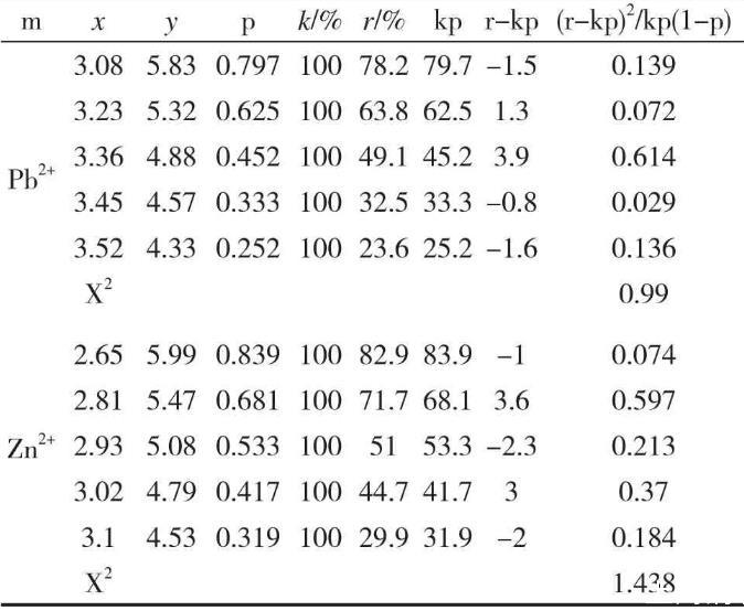 對上述劑量反應方程分別進行X2檢驗,以驗證劑量反應方程是否真實地反映重金屬離子抑制硫酸鹽還原菌生長的毒性效應,結果見表2。查X2表,當自由度為3時,X=7.82,而計算的X2分別為0.99和1.438,因為X>X2,所以上述劑量反應方程均符合精度要求,計算出的72h-EC50真實可靠。