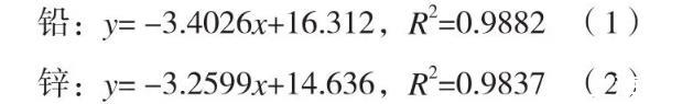 當機率單位為5時,分別通過上述方程(1)和(2)進行計算,得到鉛和鋅的濃度對數(shù)分別為3.32和2.96,再通過換算分別得到鉛和鋅抑制硫酸鹽還原菌生長的72h-EC50分別為2089.3mg·L-1和912mg·L-1。由此也再次說明鉛和鋅抑制硫酸鹽還原菌生長的毒性由大到小的順序仍是Zn2+>Pb2+。