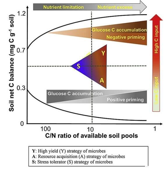 微生物生活策略對激發(fā)效應(yīng)和土壤碳平衡的化學(xué)計量調(diào)節(jié)機制的概念圖
