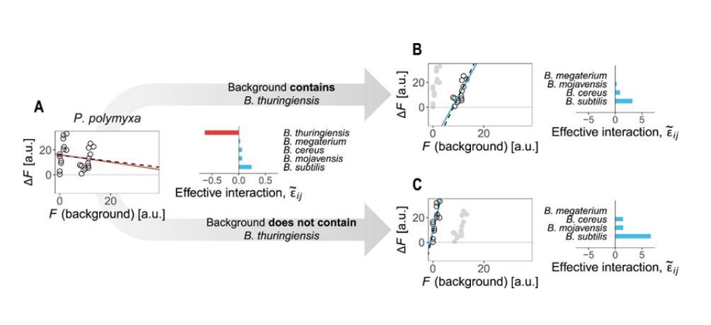 圖S14(A)當(dāng)為所有物種背景擬合單個(gè)FEE時(shí),可以觀察到負(fù)斜率,這可以通過多黏芽孢桿菌與蘇云金芽孢桿菌之間的強(qiáng)烈負(fù)有效相互作用來解釋;(B-C)當(dāng)蘇云金芽孢桿菌存在或不存在時(shí),多黏芽孢桿菌與其余物種的有效相互作用為正值,這導(dǎo)致每個(gè)分支中FEE的斜率為正。虛線表示估算的FEE,實(shí)線是數(shù)據(jù)的經(jīng)驗(yàn)性擬合結(jié)果