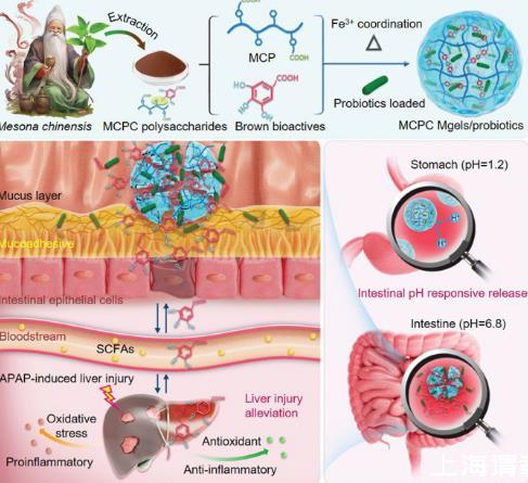 口服益生菌在加工、儲存和胃腸道惡劣條件下面臨挑戰(zhàn)?;诙嗵堑乃z遞送系統在益生菌保護方面很有前景,但其半固體且強度較弱,并且往往需要額外的交聯來固化其結構。研究人員開發(fā)了一種具有腸道反應性和粘膜粘附特性的鐵離子交聯MCPC微凝膠。首先將MCPC分離為MCP和棕色生物活性物質,并研究了它們的化學成分。然后比較了Fe3+交聯MCPC和MCP微凝膠的理化性能,尤其是機械強度。研究了負載益生菌的MCPC微凝膠的胃酸耐受性、腸道pH響應性和粘附保留特性。微凝膠成分的益生元作用也在體內進行了評估。最后,研究了其對急性肝損傷小鼠模型的緩解作用,重點關注氧化應激、炎癥和腸道菌群調節(jié)。這項研究為應用MCPC微凝膠益生菌遞送系統通過腸-肝軸緩解肝臟疾病提供了靈感,提供了一個強大的基于天然多糖的微凝膠平臺,用于通過腸肝軸控制釋放和靶向輸送具有健康潛力的益生菌。