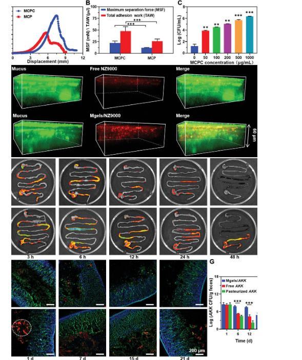 圖5、通過與MCPC介導的相互作用增強腸道粘膜粘附和益生菌定植。A)粘膜粘附曲線,B)MCPC和MCP對大鼠腸粘膜的最大分離力(MSF)和總粘附功(TAW)。C)MCPC濃度對粘液粘附益生菌影響的菌落計數。D)粘液(用綠色Alexa Fluor 488-WGA標記)滲透無紅色和嵌入NZ9000的CLSM 3D圖像。E)FITC標記的游離WCFS1或MCPC/WCFS1在胃腸道中的滯留。F)紅色游離NZ9000或MCPC/NZ9000在腸粘液中的分布。空腸粘液用綠色Alexa Fluor 488-WGA染色,腸絨毛細胞核用藍色DAPI染色。G)小鼠糞便中各種AKK的菌落計數。