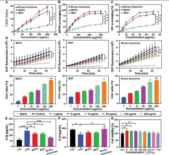 圖3、評估MCPC、MCP和棕色生物活性物質的體外抗氧化、抗炎和細胞毒性特性。A)總抗氧化能力(T-AOC),B)DPPH自由基,C)MCPC、MCP和棕色生物活性物質的羥基自由基清除能力。D)MCPC、MCP和棕色生物活性物質的細胞抗氧化活性。使用MCPC、MCP和棕色生物活性物質進行酶聯免疫吸附測定(ELISA),以檢查E)IL-1β和F)IL-10的水平。原始246.7細胞用MCPC、MCP和棕色生物活性物質(200μg mL?1)預處理24小時。G)MCPC對Caco-2細胞的細胞毒性評估。