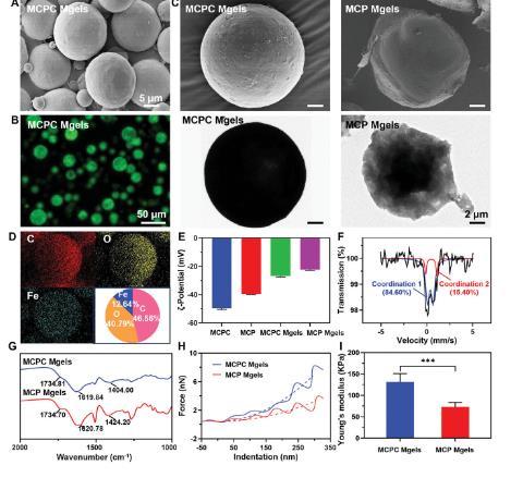 圖2、MCPC和MCP微凝膠的制備和表征。A)MCPC微凝膠的SEM。B)用羅丹明B染色的MCPC微凝膠的光學顯微鏡圖像。C)MCP和MCPC微凝膠的SEM和TEM。D)MCPC微凝膠的元素圖譜。E)MCPC、MCP及其微凝膠的z-電位。F)MCP微凝膠的穆斯堡爾譜。G)MCPC和MCP微凝膠的FT-IR光譜。H)納米壓痕力-距離曲線,I)MCPC和MCP微凝膠的楊氏模量。