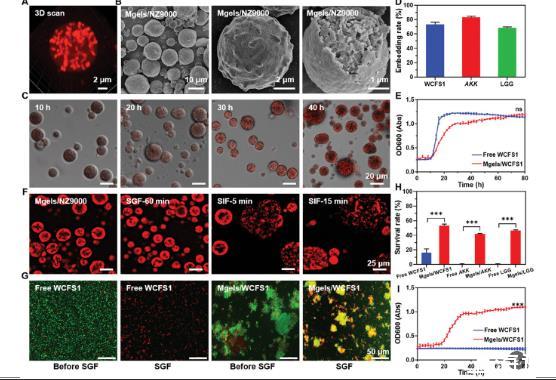 圖4、pH響應型MCPC微凝膠可實現腸道響應性釋放并增強益生菌的活力。A)CLSM和B)加載NZ9000(紅色)的MCPC微凝膠的SEM圖像。C)CLSM圖像顯示NZ9000在M17肉湯(pH 5.5)中的微凝膠中生長。D)微凝膠對各種益生菌的包封效率。E)Bioscreen C全自動生長曲線分析儀測試MRS肉湯中游離WCFS1和MCPC/WCFS1的生長曲線(80h)。F)MCPC/NZ9000微凝膠在SGIF中處理前后的熒光圖像。G)活細胞(綠色)/死細胞(紅色)活力,H)存活計數,I)Bioscreen C全自動生長曲線分析儀測試游離WCFS1和MCPC/WCFS1在SGF處理前和處理30分鐘后的對應的生長曲線((80h))。