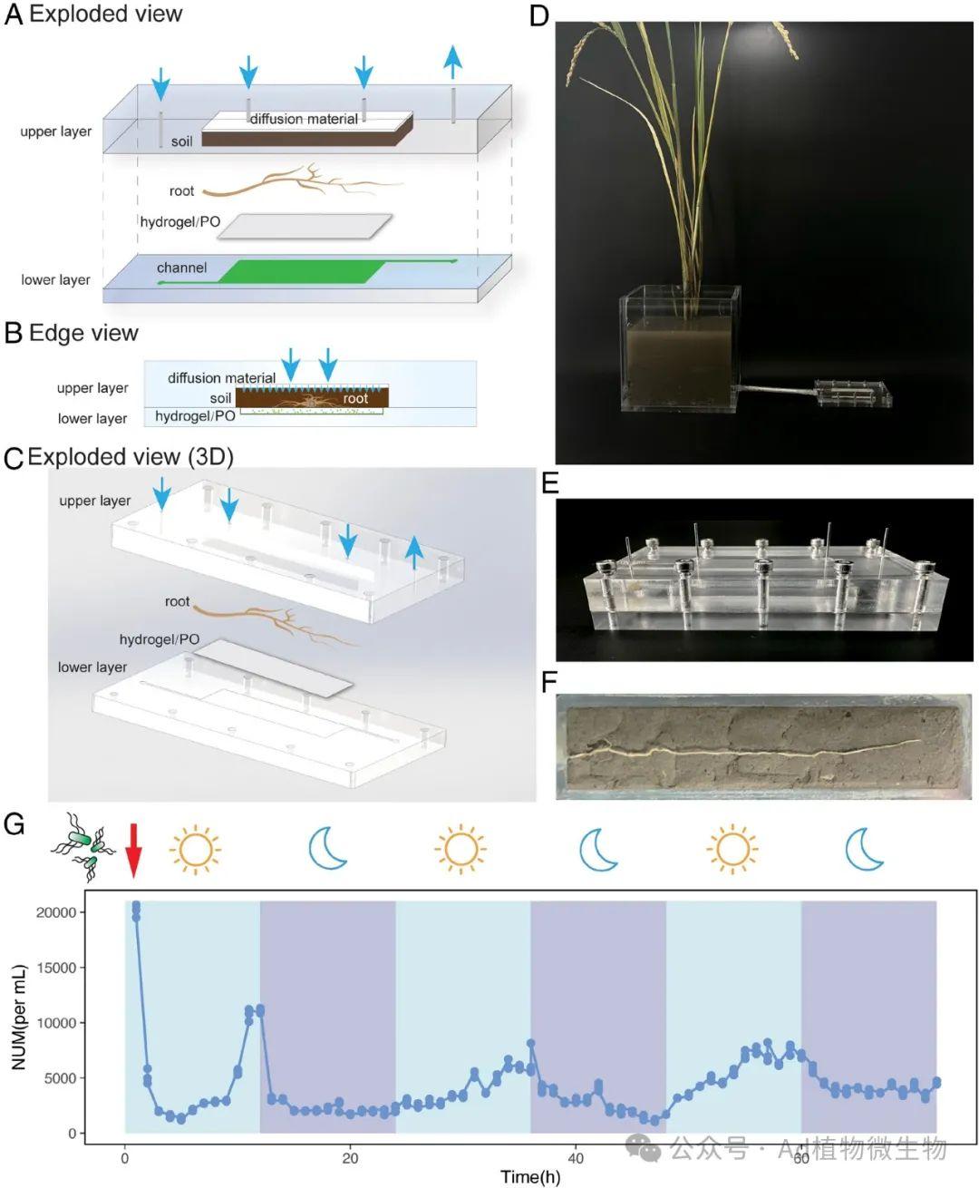 使用該裝置研究根際內(nèi)微生物的行為后,科研人員發(fā)現(xiàn)了枯草芽孢桿菌在根際中明顯的晝夜波動(dòng)生長(zhǎng)現(xiàn)象。對(duì)根際溶解氧(DO)、pH值、溶解有機(jī)碳及活性氧物種的時(shí)間動(dòng)態(tài)分析表明,枯草芽孢桿菌的晝夜波動(dòng)生長(zhǎng)可能與多種環(huán)境因素有關(guān)。空間動(dòng)態(tài)分析也顯示,枯草芽孢桿菌的空間分布變化與DO和pH值的變化相似。隨后,通過(guò)體外控制實(shí)驗(yàn),科研人員證明了根際DO和pH值是導(dǎo)致枯草芽孢桿菌晝夜波動(dòng)生長(zhǎng)的主要驅(qū)動(dòng)力??蒲腥藛T的結(jié)果表明,枯草芽孢桿菌的生長(zhǎng)由根際DO和pH值驅(qū)動(dòng),從而產(chǎn)生晝夜波動(dòng),且iRhizo-Chip是研究植物根際動(dòng)態(tài)的一個(gè)有價(jià)值的工具。
